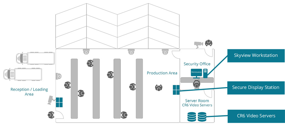 Cannabis production facilities require high levels of physical security, visual monitoring and access control. Surveillance is ensured through the deployment of a high number of security cameras and video data must be consistently and reliably recorded to secure storage and be kept for at least one (1) year. Enterprise class video servers, such as the CR6 line of servers, with large storage capacity, often over a petabyte, high recording throughput and built-in redundancy are therefore required. Monitoring is ensured through dedicated client video workstations and live video walls deployed at various locations on the site. Skyview workstations and Secure Display Stations are designed for 24/7 video monitoring and offer the high levels of performance required for displaying multiple high-quality video streams on multiple monitors. These products are designed to offer guaranteed compatibility with the leading Video Management Software platforms selected for these large-scale projects, such as Milestone XProtect and Genetec Security Center.