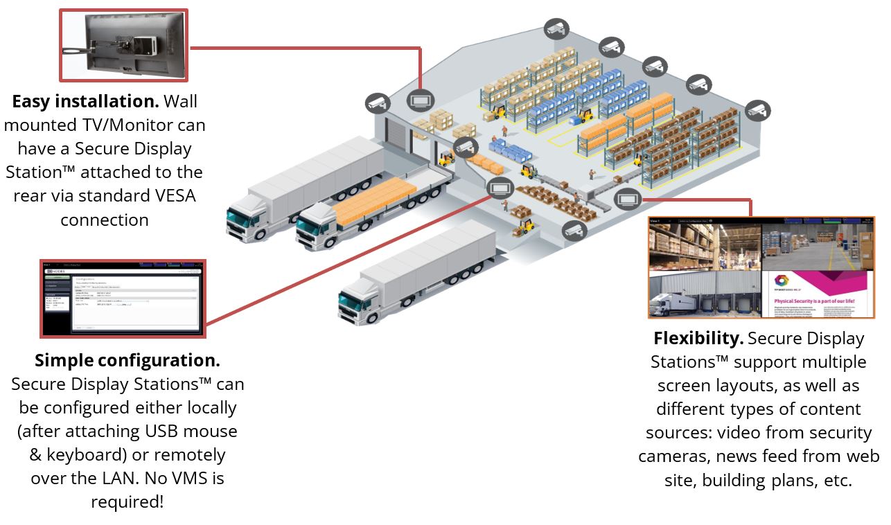 Monitors near building exits and loading bays, displaying live video from these less secure areas provide enhanced awareness of any safety risks BEFORE staff exit the secure environment of the facility. Secure Display Stations can be used to display live video from these areas on a single or dual monitor video wall. The cameras and display layouts are configured during initial deployment. These small, easily deployable appliances are then typically mounted directly behind one of the monitors. One or more security messages can also be displayed on the monitors for added impact.