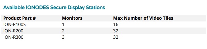IONODES Secure Display Stations have been designed to use live video monitoring to promote more secure environments. They can display live video on a variety of digital monitors without the cost, complexity and security risk of a client workstation. This is ideal in public areas and in remote sites or facilities with few or no trained security staff. The ION-R100S, ION-R200 and ION-R300 Secure Display Stations can display up to 32 IP video streams, on one, two or three 4K monitors, and typically operate independently of any video management system (VMS) or NVR.