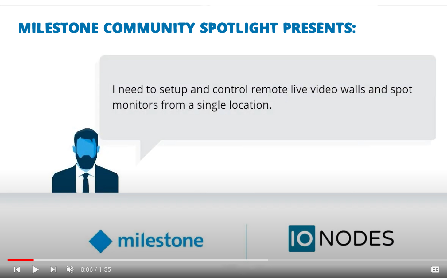 Visitez notre page sur le MarketplaceMilestone Community Spotlight est une collection de courtes vidéos dirigées vers des déclarations GOAL. Les vidéos expliquent comment les partenaires technologiques Milestone résolvent les objectifs des utilisateurs via la mise en œuvre de leur technologie dans l'écosystème Milestone XProtect®.