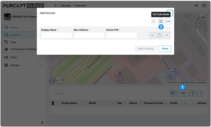 2. In the Add Devices dialog, click on the QR Code Mode If prompted by your web browser, grant it access to your device’s camera.