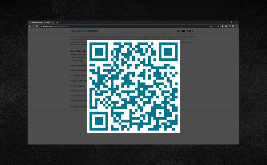On first boot up of your PERCEPT Body Camera, the camera will be searching for a QR Code to initialize base parameters needed to connect to your Wi-Fi network. This initial QR code will also allow you to set the default ‘administrator’ password, select the device’s language, set up wearer ID behaviour and choose whether to enable silent mode or not. The QR Code Generator will also allow you to make in-field changes when needed, such as wearer ID or Wi-Fi changes.